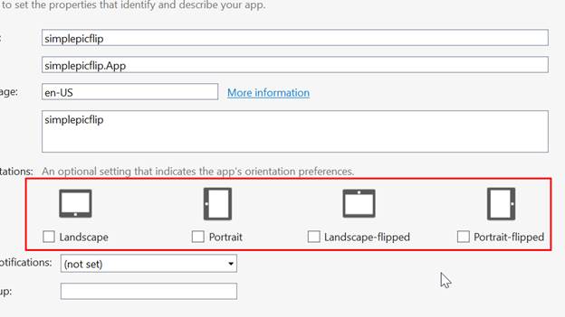 Move to Package.appxmanifest in Solution Explorer. Package.appxmanifest holds the properties of the deployment package for our app are available in this app manifest file. We can use the Manifest designer to set or modify one or more of the properties.