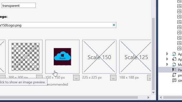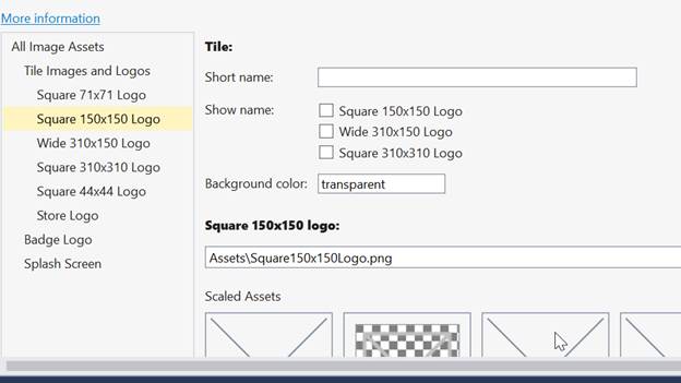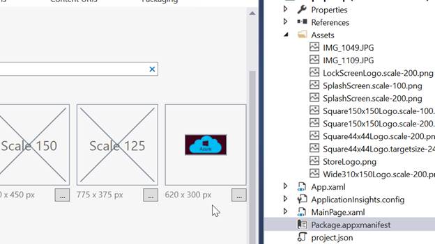 Windows Store apps should support display of the different resolutions. Windows provides a simple way to do this, via resource loading. This selection lists all the assets, which are used in the manifest.