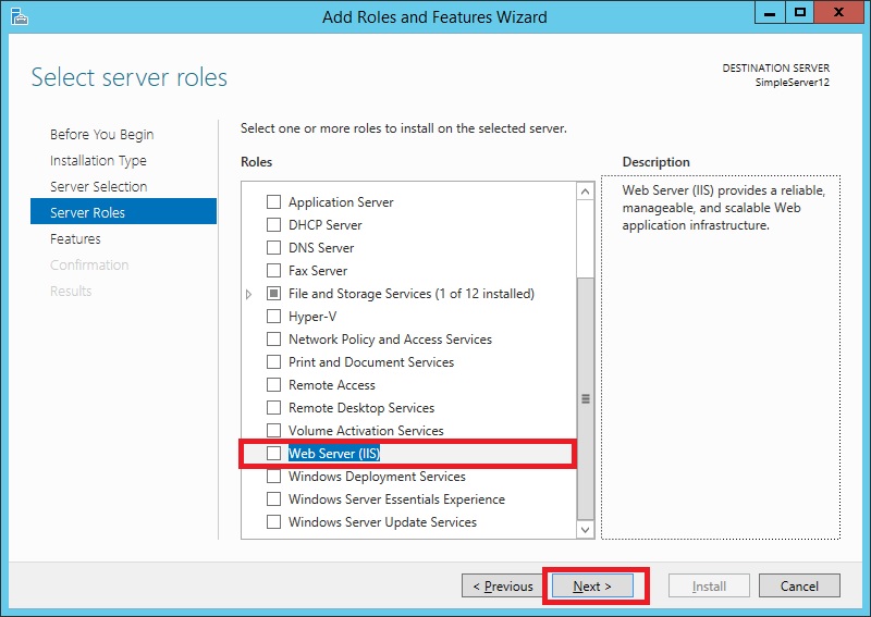 In the Server role, select “Web Server(IIS) and click add features, when the pop up appears” and click Next.