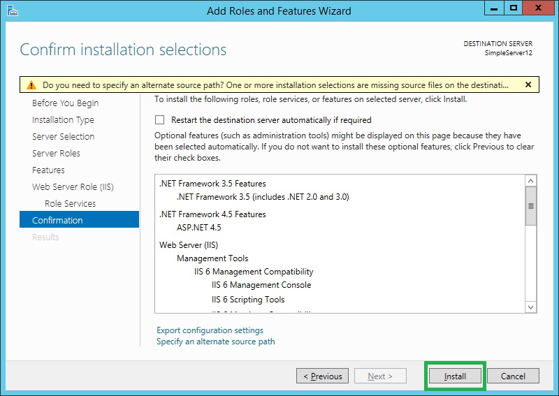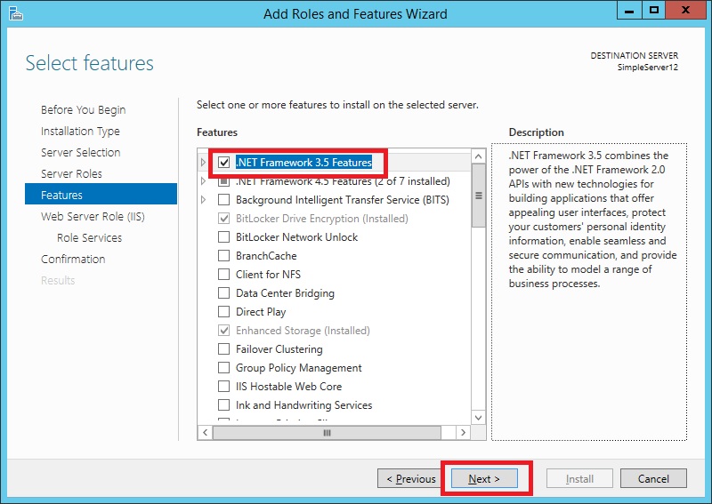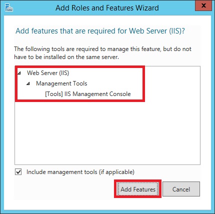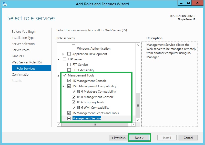 In the Web Server IIS role, select all the features under the management tools, IIS management console, compatibility and click Next.