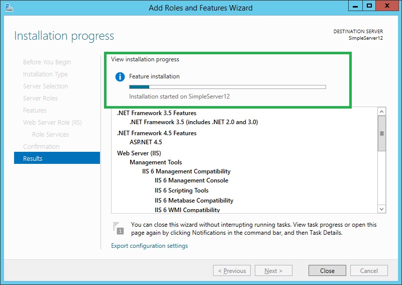 In the installation Window, it starts the installation after some time. The feature installation starts. Click close when the installation is done.