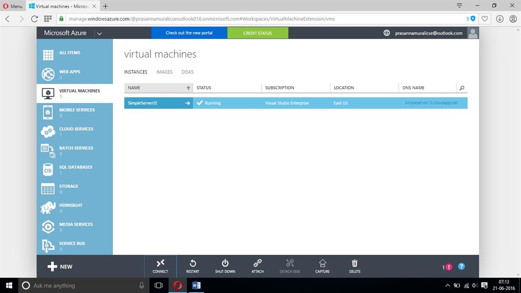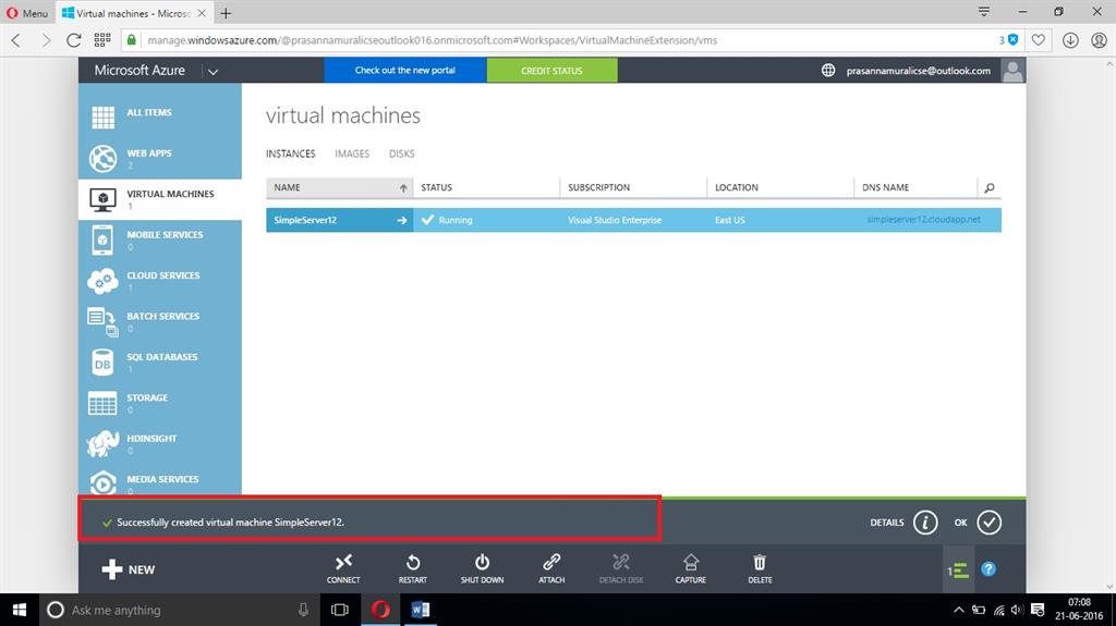 Azure management portal will take some time and finally the message appears as “Successfully created virtual Machine SimpleServer12”.