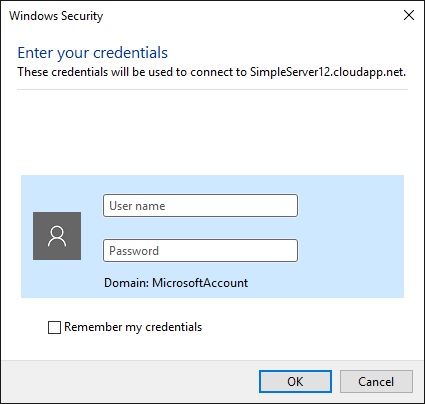 In the Windows security tab Window, click the username and password that is used, when creating a virtual machine and click OK.
