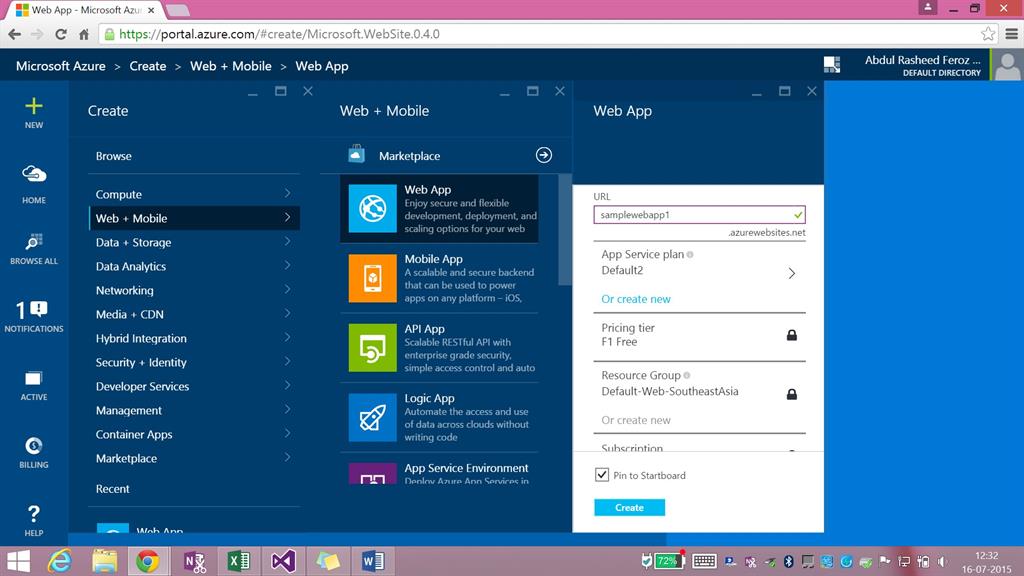 Enter the URL name, select app service plan (something of your own), pricing tier (F1 Free), Subscription (Dreamspark), Location of your Datacentre as South East Asia. Click on Create and your web app gets created.