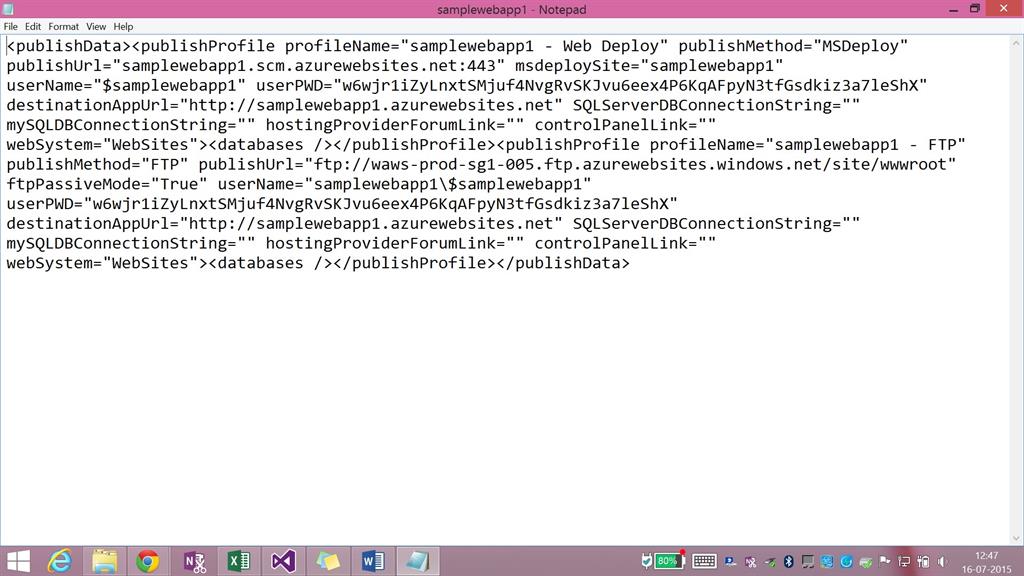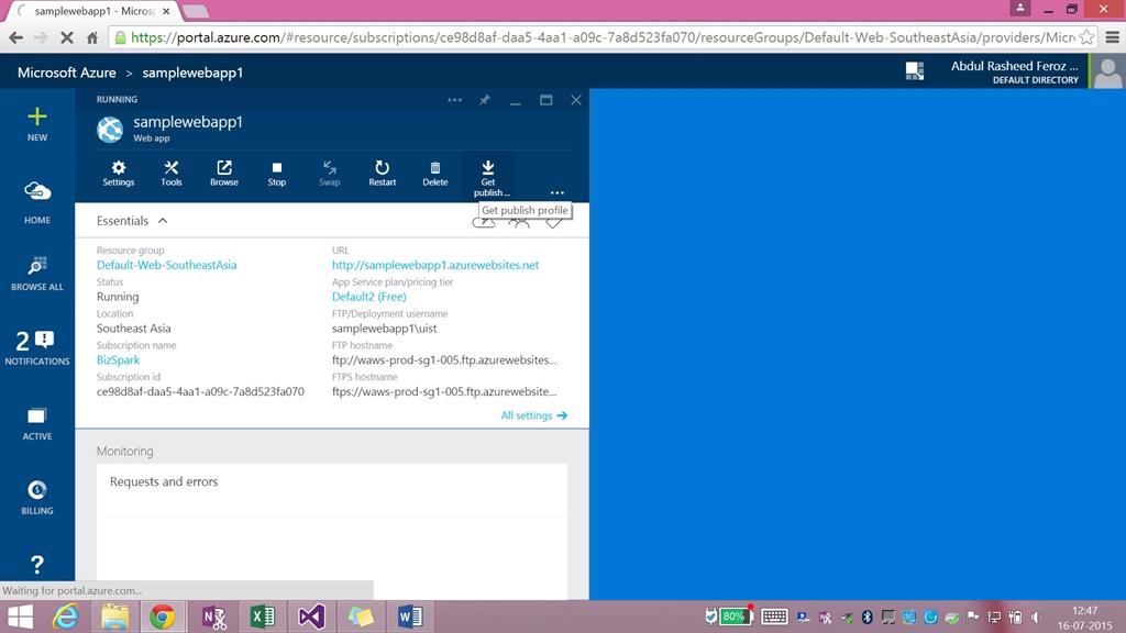 Step 5: Now click on the web app that has been created (here it is samplewebapp1) and download the publish profile information.