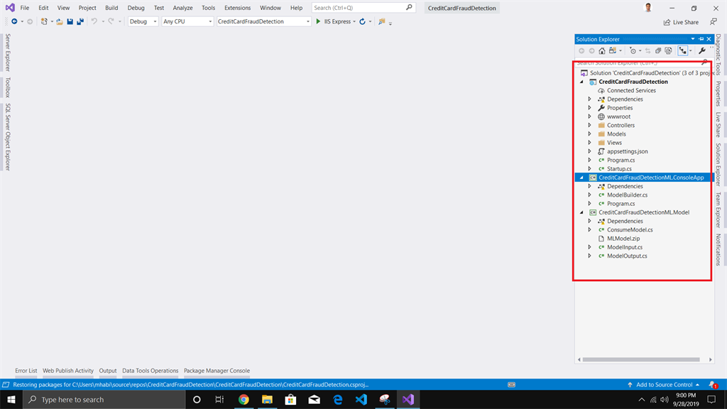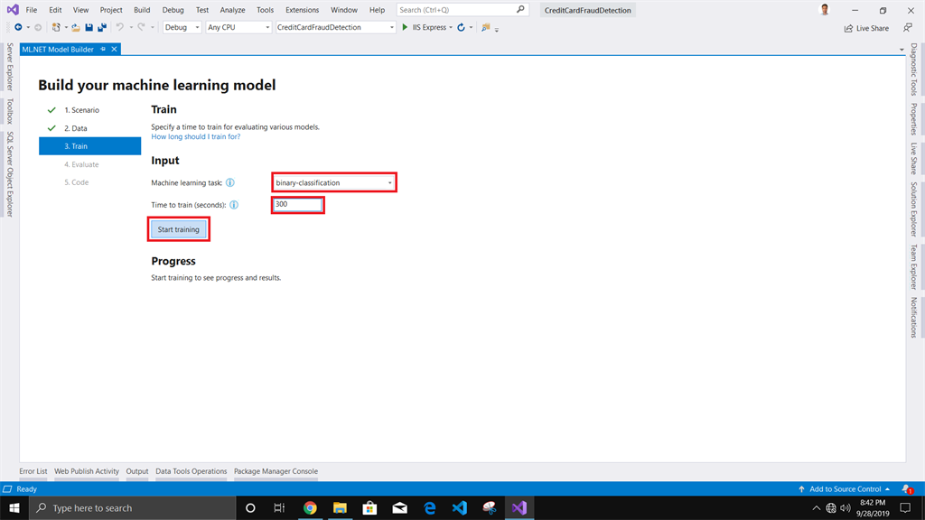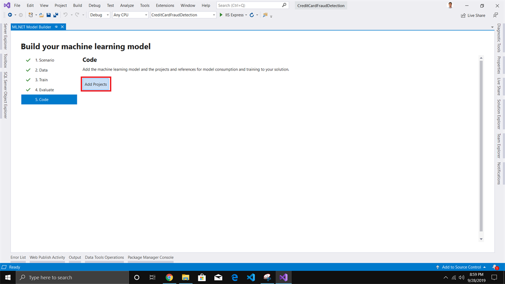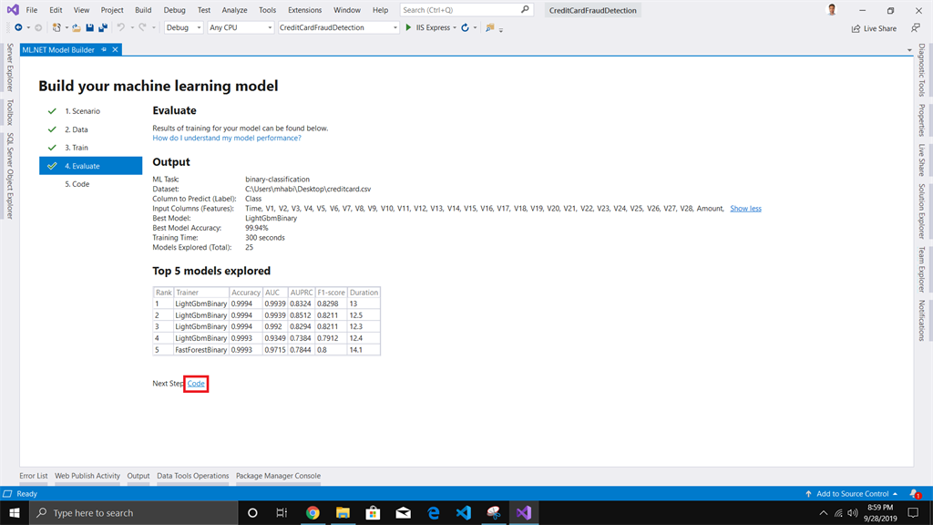 In this article, we have used ML.NET Model builder to build our Credit Card Fraud Detection machine learning model.