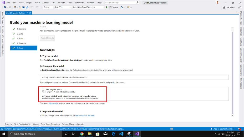 - Our ML Modle project has been added to our Visual Studio solution. Now we will use the shown ML.NET Model builder window to consume this model.