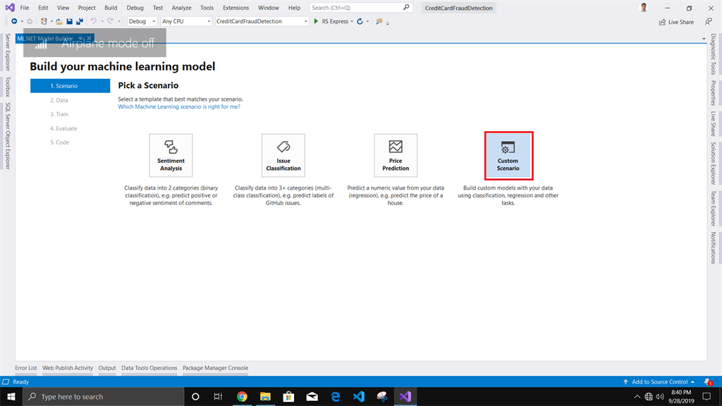 - ML.NET Model Builder window will be shown. Now select custom scenario because we are going to build our model from our Credit Card Fraud detection dataset.