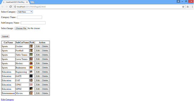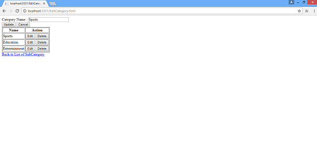 Next there is a div which contains catName textbox which is initially not visible and will be visible when user clicks edit button.The div also contains Update and Cancel button to update catName or Cancel the updation respectively.