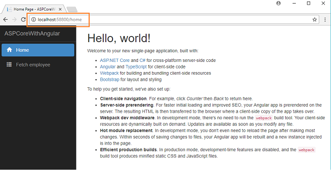 A web page will open as shown in the image below. Notice the URL showing route for our home component. And navigation menu on the left showing navigation link for Home and Fetch Employee pages.