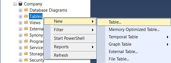 Expand Company Database -> Right Click on Tables -> New -> Table.