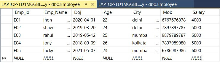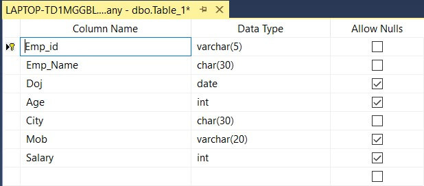 Enter these values and save table as Employee. Press f5 you can see table after expanding Tables -> dbo.Employee.