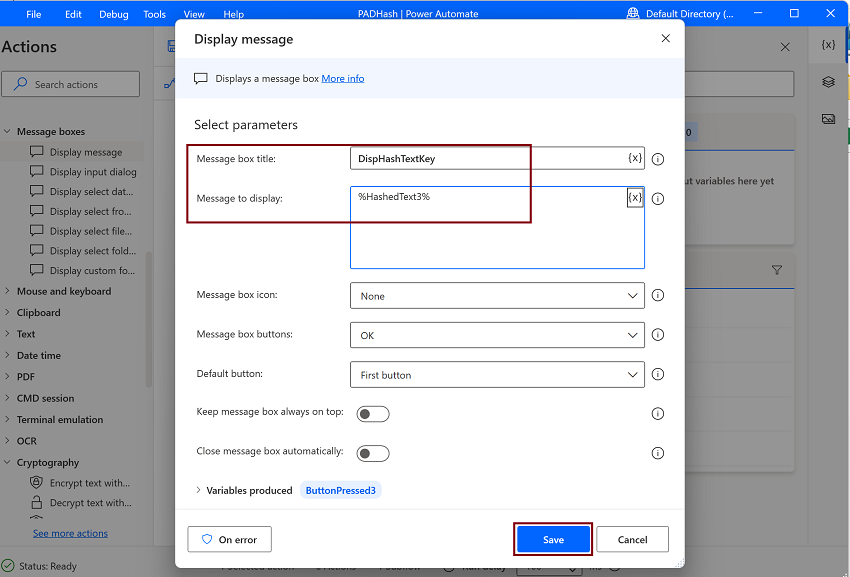 For Displaying the Hash text with key output, Add the Display message action, Set the Message box title Parameter value as DispHashTextKey, Message to display Parameter value as %HashedText3%, and Click Save Button