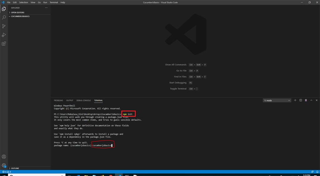 Create a folder in the local system Ex: "Cucumberbasics" -> Open the folder in Visual Studio code.