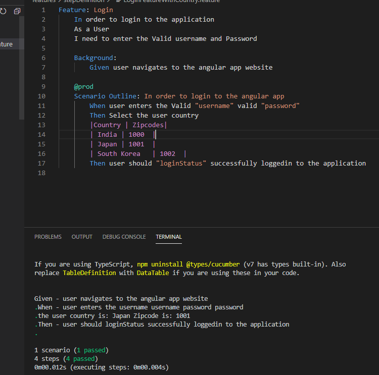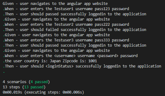 You can see in the result, IT has executed previous feature files as well. This is the example for Multiple feature file and you can see the country and the zip code in the last scenario i.e "Japan" and Zipcode is "1001" is printed.