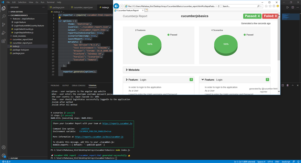 This is the last section of this article. So far, we have learned all the basics of cucumber, like creating a file, creating a feature file, and adding the step definition, creating tags, and creating hooks. Essentially all the things we executed in the Visual Studio editor terminal itself. Now let us see how to generate HTML reports and view an output.