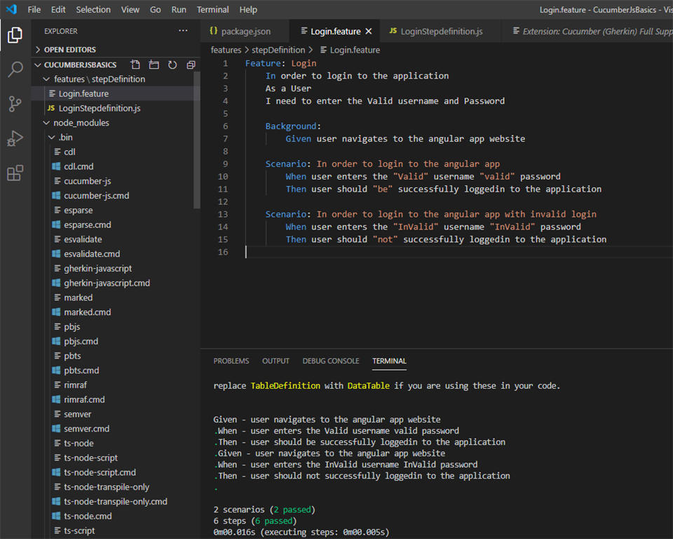 In order to run this in "Visual Studio code," you need to navigate to "node-module" -> bin-> cucumber.js file this will help you to run the cucumber files.