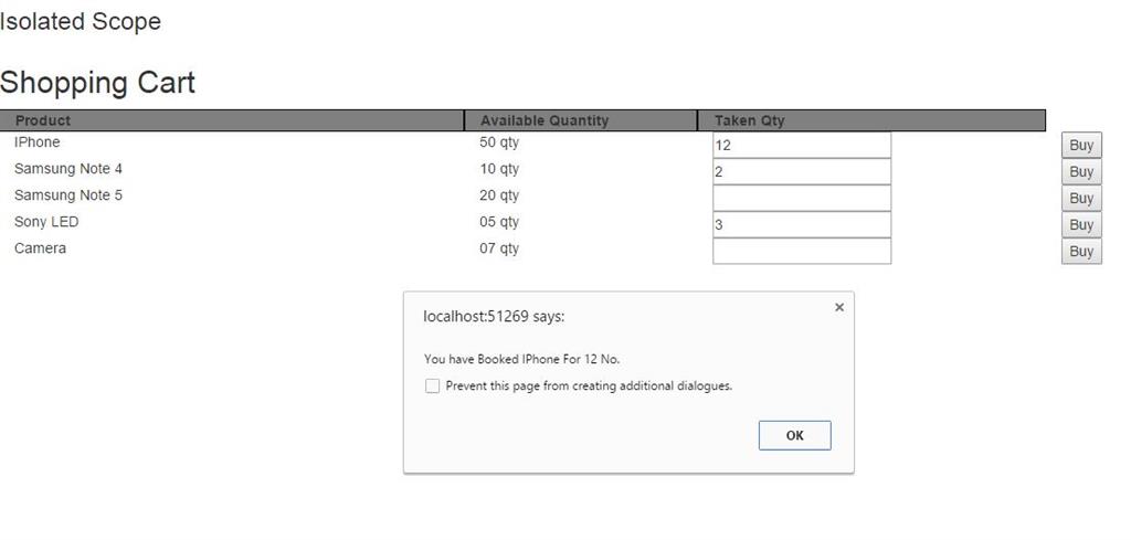 In my previous article, we discussed the different types of directives. Now, in this article, we will discuss the isolated scope of the directive. Now when we create element based directives, then we define two different types of scope within the directives. One of them is shared scope and another is isolated scope. Since Angular js always maintains its two-way binding technique when any element is updated within the directive, then it always updates all the related elements in the directive. Basically it is called shared scope. For a demonstration of this, we will create a page just like a shopping cart where multiple items will be displayed in tabular format and we can putin the required items and click on the buy buttons.