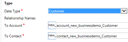 - Select customer data type from data type drop down and you will see the relationship names, as shown below. It will setup two N:1 relationships between your custom, an account and similarly with contact entity.