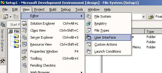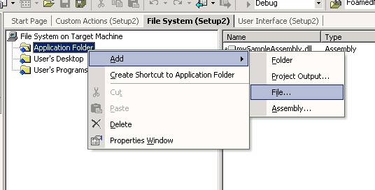 9. We now need to add this newly compiled assembly to our MSI project that we were working on earlier. Go back to the MSI project we were working on earlier and click on the View/Editor/File System, which will bring up the file system editor in the msi project. Right click on the application folder and choose add/File as shown below.