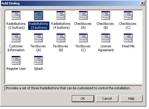 This will bring up the Add Dialog menu displaying all of the various user dialogs you can add to the msi. We are going to add 3 radio buttons to the default user interface that prompts the user for his/her input in regards to what environment the application is being deploy into Dev, Test, or Prod. This is common issue when building deployment scripts, as we may need to do different things based on the environment we are deploying too. Select the Radio Buttons (3 buttons) icon as shown below: