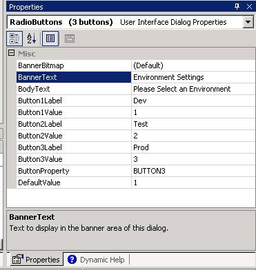 An important thing to notice is the ButtonProperty that is currently set at BUTTON3. This is the name of our newly added user interface item and ultimately the variable that holds the value that the user has entered when the MSI is run. In our case the screen we added contains three radio buttons and based on what the user chooses at the time of the install the BUTTON3 variable will hold a 1,2 or 3.