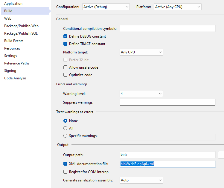 The output XML file: --- In the location at bin\WebBlogApi.xml