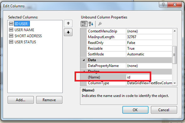 This button returns a list of class _user, and fills the grid. For this exercise columns were created in the grid, then the properties of the _user class are traversed and the Name value is assigned to the property of the dataGridView2.Columns [n] .DataPropertyName,