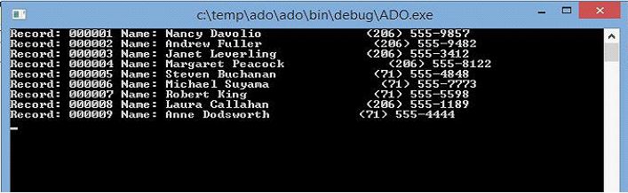 Notice, we have done a 'primer' read of the data, set prior to executing the Perform loop. This is interesting to see if we have the data to process or not, then we will not execute the Perform loop. Within the Perform loop, there are three "GetString" invocations to return the First Name, Last Name and Home Phone Number of the employee. We keep a count of how many records we've read and then display the record on the console. Finally, we read to determine if there is more data to process and then if there is; repeat the process or exit the Perform loop.