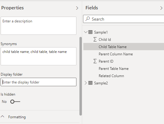 - We can also organize the fields in a table from the model section of power bi and store them in a specific folder as shown below.