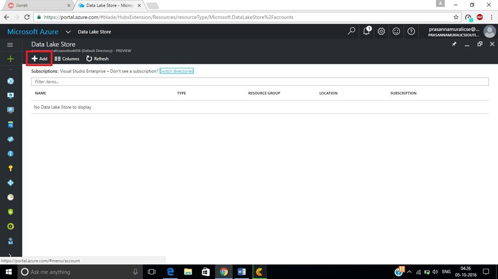 In the Data Lake Store, click "Add" button to create a new service in Microsoft Azure. If you don’t see your subscription, click refresh option.