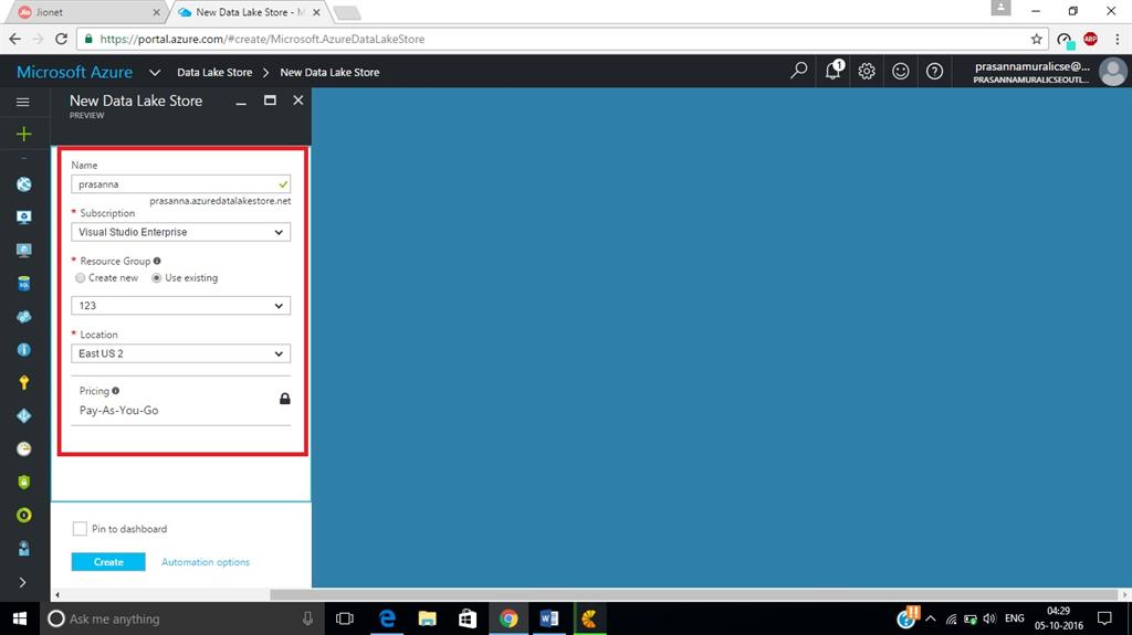 Now, in Data Lake Store creation wizard, fill the basic credits such as Name, Subscription, Resource group, and pricing, and tick the option - "Pin to dashboard".