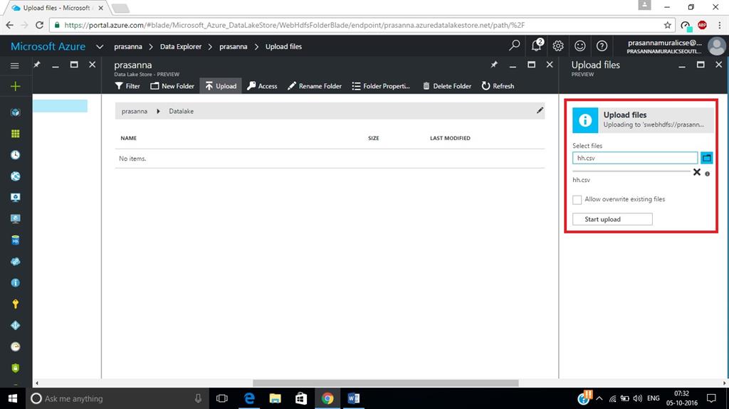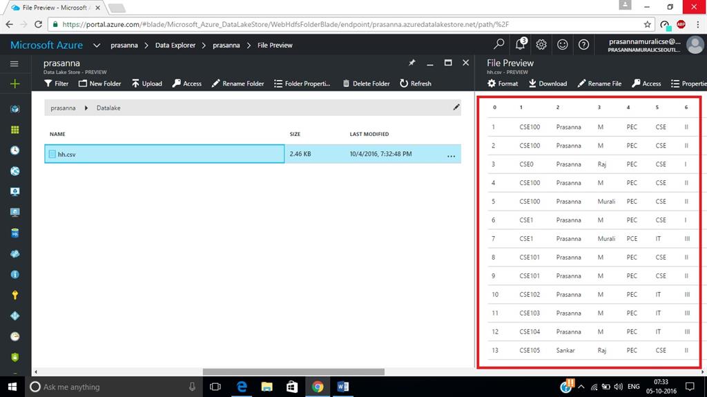 In this article, we have created an account in Azure Data Lake Store and uploaded a sample file.