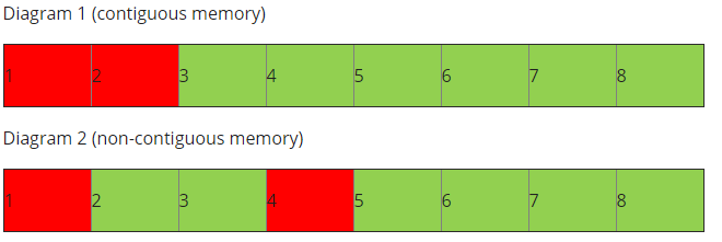 As per the above example, Diagram 1 is Contiguous memory and Diagram 2 is non-Contiguous memory.