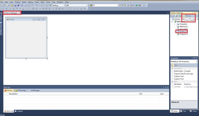 Now, you click on the Form1.cs and click to view code icon. and drag the code window to your right side for your convenience.