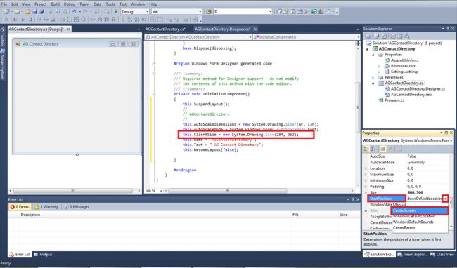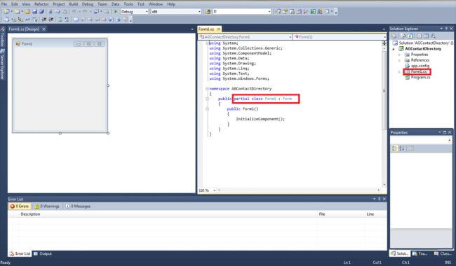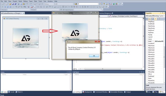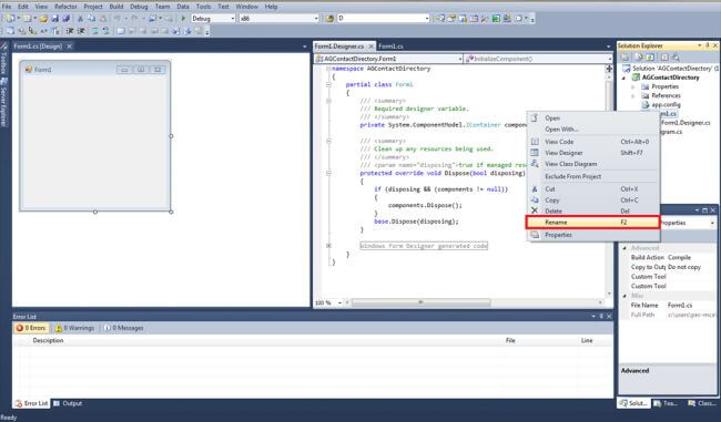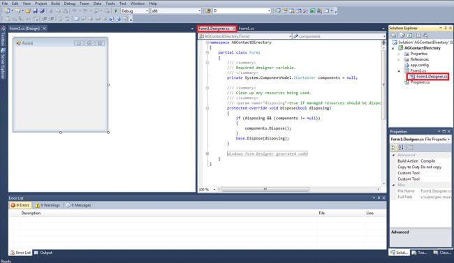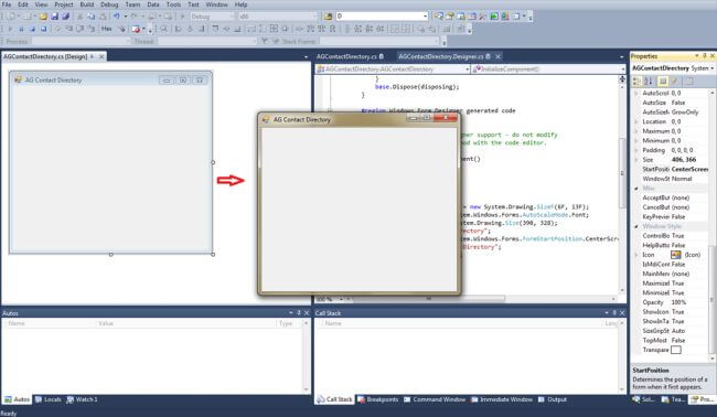 Click on the Form and go to the property and change the text into AG Contact Directory. The Designer code text will be changed.