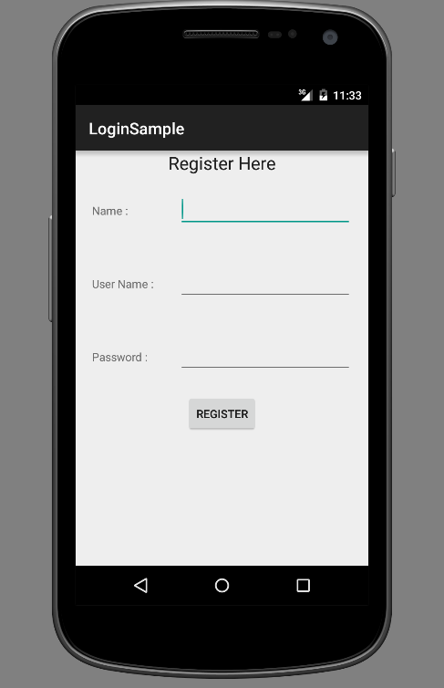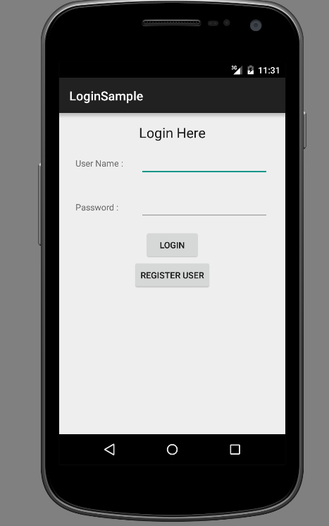 This contains two edit texts where the user can enter their user name and password. This contains two buttons: Log in and Register. On clicking the Login button we need to check the database so that the user details exist or not. Another button named Register will call the Register Activity.