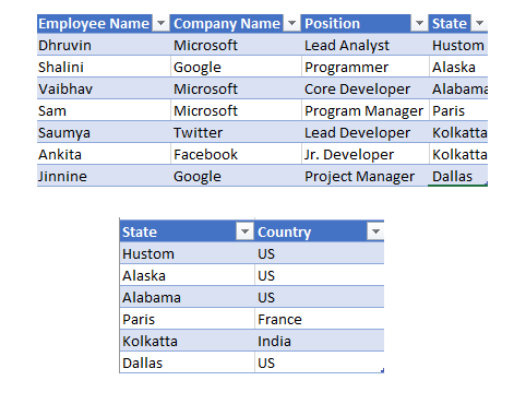 In short, State from the Employee Information table will look into State from the Master table and display the value of the Country from it.