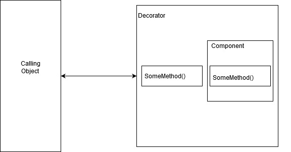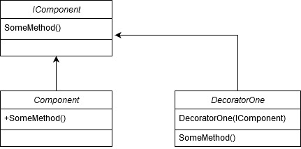 Not only our DecoratorOne class IS-A IComponent but also it HAS-A IComponent. This is because the decorator class implements the same interface as the original Component class, so it now has a chance to intercept any method calls on the interface and inject some additional behaviour into those calls.