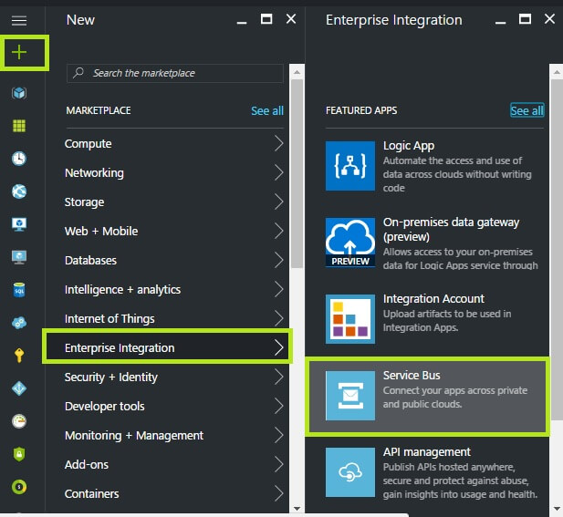In the Jump bar, click New followed by clicking Enterprise Integration and then click Service Bus.