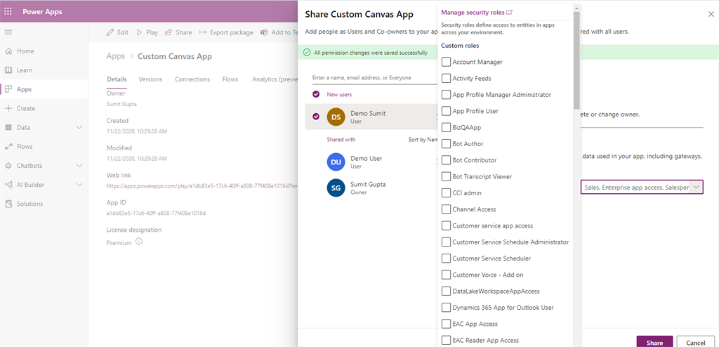 - Apps ( Canvas: Model-Driven Apps) shared by the user are again controlled by the security role which has to be assigned while sharing the app.