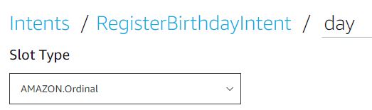 A required slot represents information that your skill must have in order to fulfill the user's request. For instance, the RegisterBirthday intent requires, at a minimum, the day (day), month (month), and year (year) to save birthday details for the future. You can control the order in which Alexa asks for the slot values.