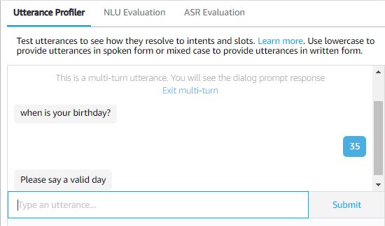 From the output, we can see that after invoking the skill, Alexa asks for the date of birth. If the user provides an unacceptable value, then Alexa will prompt a message saying “Please say a valid day” to ensure the user provides a valid day of the month.