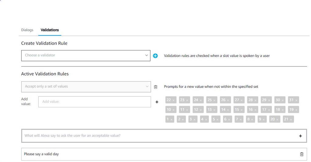 In this article, I have demonstrated how to define validation rules for slots and how to define prompts to warn users if a user provides an unacceptable value for any slot this way Alexa can validate user response. I have also explained one of the components of the dialog model. Proper examples of Alexa speech prompts and user utterances are provided along with the JSON code snippet of the interaction model.