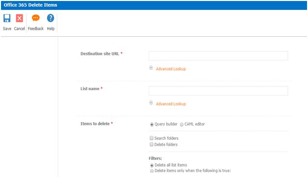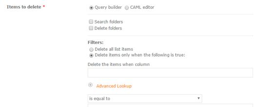 - Items to delete - You can use a query to delete the items by using a query builder or a CAML editor. Here, you can configure - whether you want the folders to be included, based on your library or not.