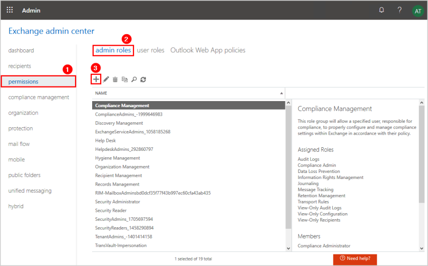 Sign in to Exchange Admin Center (Exchange Online). In the feature pane, click on permissions and follow with admin roles in the tabs. Click the + icon in the toolbar to create a new role group.