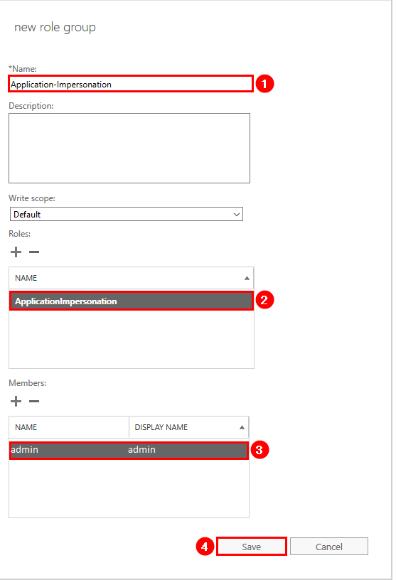 Give the new role group a name — for example, Application-Impersonation. Assign the role of Application-Impersonation. Add yourself, the global admin, or the service account that you created as a member. Click Save when done.