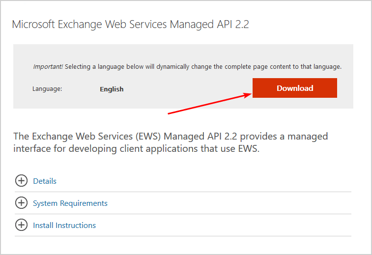 Download and install Microsoft Exchange Web Services Managed API 2.2. Save the file to the system.