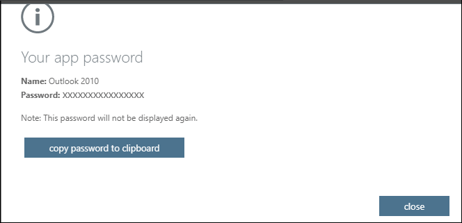 Copy the password from the Your app password page, and then select Close.