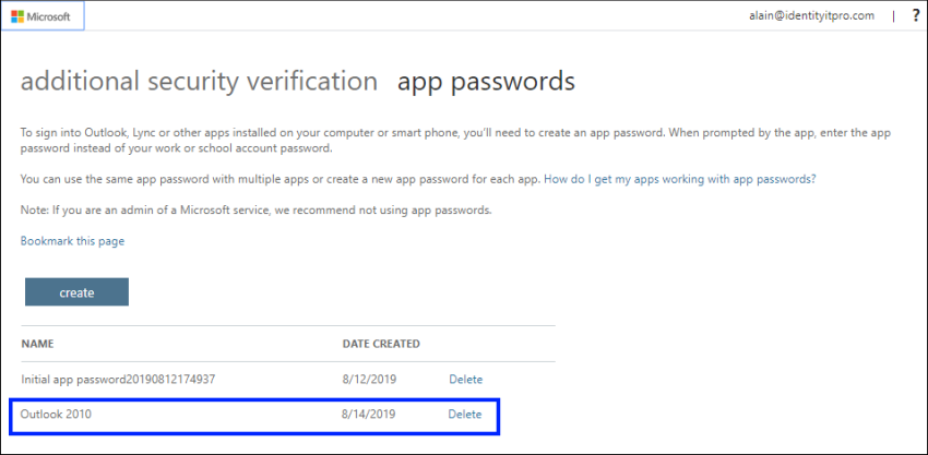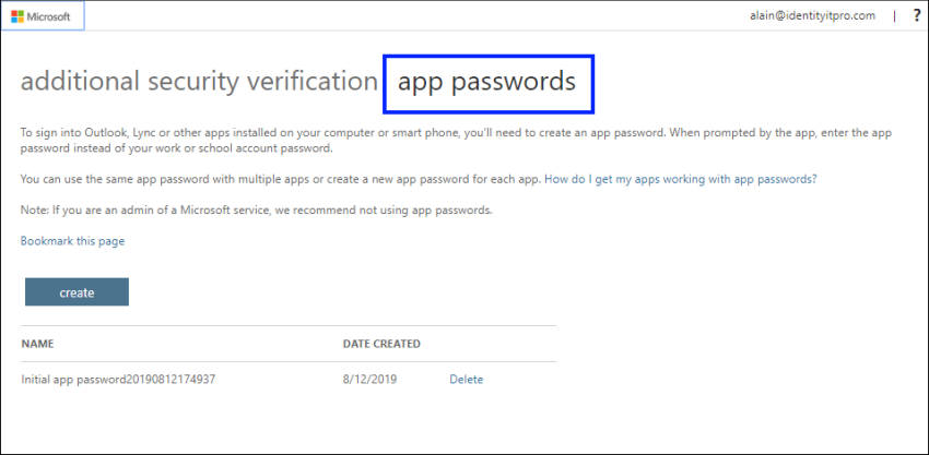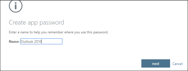 Select Create. Type the name of the app that requires the app password – For example Outlook, Exchange Script, etc -- and then select Next.